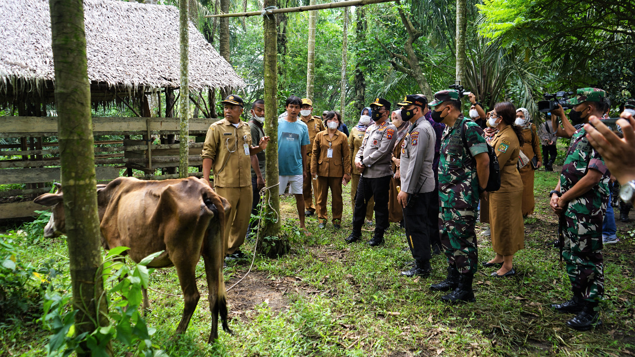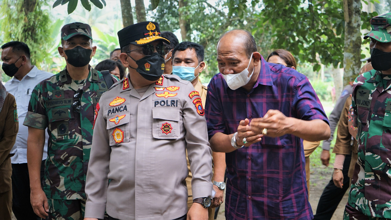 Pelaksana Tugas (Plt) Bupati Langkat, H Syah Afandin SH bersama Kapolda Sumut, Irjen Pol Drs RZ Panca Putra Simanjuntak MSi dan Kasdam I/BB, Brigjen TNI Purwito Hadi Wardhono meninjau ternak sapi terkait PMK, di Lingkungan 10 Sei Meran Kelurahan Bukit Kubu Kecamatan Besitang, Langkat, Selasa (24/5/2022).