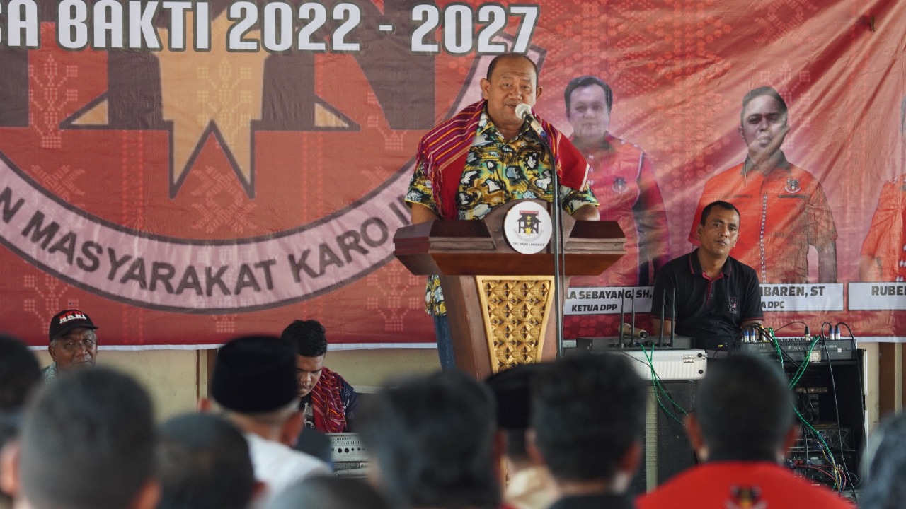 NON-STOP.id – Pelaksana Tugas (Plt) Bupati Langkat H Syah Afandin SH hadiri pelantikan Dewan Pimpinan Cabang Himpunan Masyarakat Karo Indonesia (DPC HMKI) Kabupaten Langkat periode 2022-2027, di Jambur Margasilima Stabat, Langkat, Sabtu (29/10/2022).