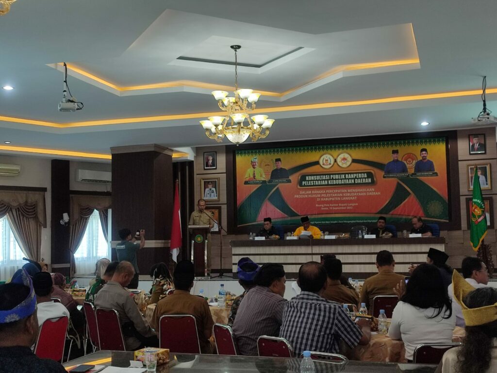 NON-STOP.id – Dewan Syarikat Melayu Langkat (DSML) bersama Pemerintah Kabupaten Langkat gelar konsultasi publik Ranperda pelestarian kebudayaan daerah Kabupaten Langkat, di Ruang Pola Kantor Bupati Langkat, Stabat, Senin (19/9/2022).