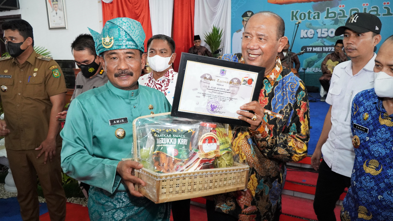 Pelaksana Tugas (Plt) Bupati Langkat H Syah Afandin SH mendapatkan piagam perhargaan dan cenderamata dari Walikota Binjai Drs H Amir Hamzah M.AP pada resepsi Hari Jadi Kota Binjai ke 150 tahun, bertempat di Pendopo Umar Bakrie Rumah Dinas Walikota Binjai Jl.Veteran No.9 Tangsi Kecamatan Binjai Kota, Kota Binjai, Selasa (17/5/2022). (Foto Diskominfo Langkat)