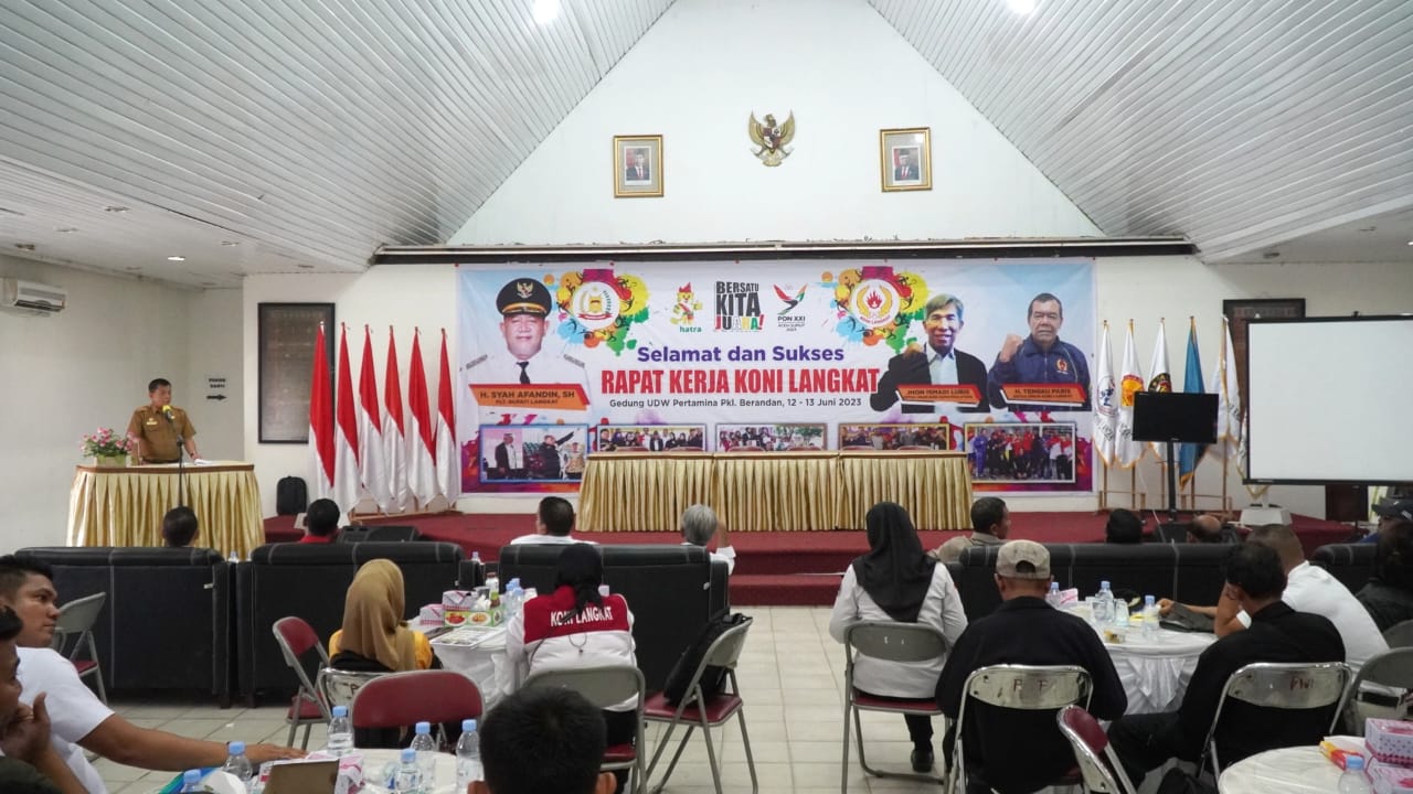 NON-STOP.id – Pelaksana Tugas (Plt) Bupati Langkat H Syah Afandin SH diwakili Asisten Pemerintahan dan Kesejahteraan Rakyat Drs.H.Mulyono,M.Si menghadiri rapat kerja KONI Tahun 2023, bertempat di Gedung UDW Pertamina Pangkalan Berandan, Kecamatan Sei Lepan, Senin (12/6/2023).